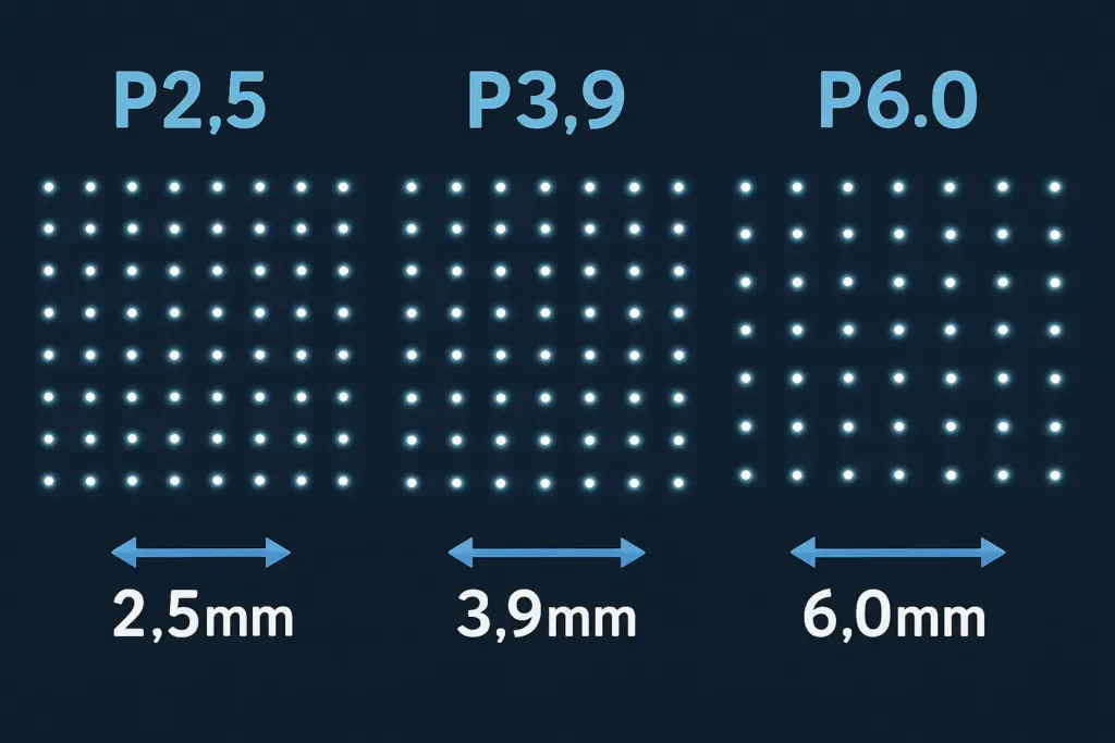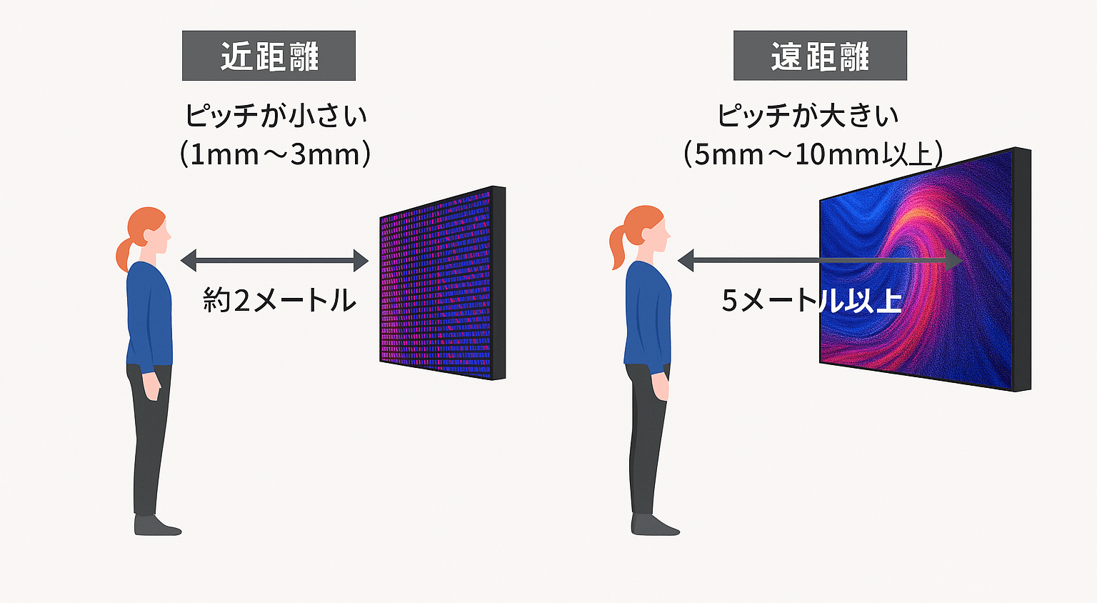 近距離で高精細な映像を求める場合はピッチが小さいもの(1mm~3mm)を選ぶ。遠距離で大きく目立たせたい場合はピッチが大きめのもの(5mm~10mm以上)が適しています。