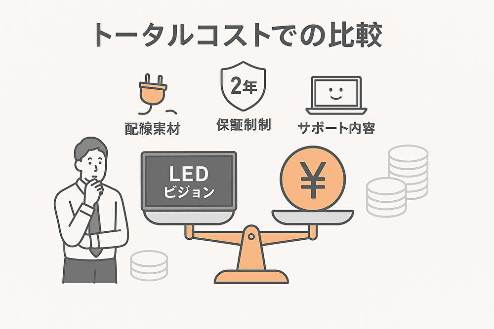 LEDビジョンは単純な本体価格だけでなく、設置費用や維持費、耐久性なども含めてトータルコストで判断することが重要です。他社と比較する際には、配線素材、保証体制、サポート内容を含めた総合的な評価をしましょう。